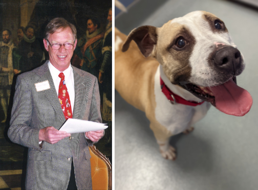 Left: Em Hughes speaks at an event for the Campaign for a Compassionate Solution in this file photo from 2002. Right: His namesake Em Hughes is a dog who is available for adoption. We transferred her into our care from Chesterfield County Animal Services.