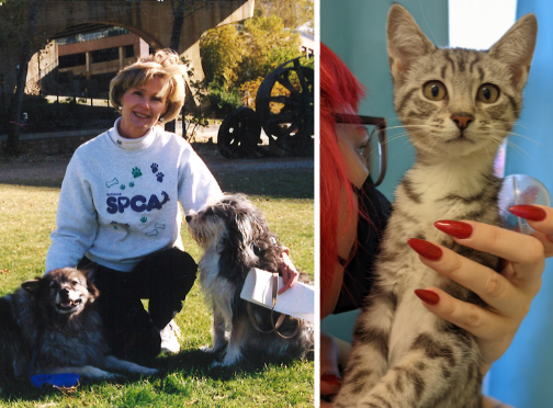 Upper left: Tamsen Kingry hugs her beloved dog Diesel, whom she adopted near the end of her internship in 2002, in a photo from our archives. Surrounding photos: Her namesake Kingry is a kitten who was adopted in January after we transferred him into our care from the Hopewell Animal Shelter.