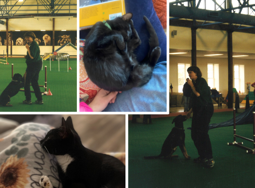 Upper left and right: Sarah Babcock and her dog Crosby perform training demonstrations in this file photo from the opening of our humane center at 2519 Hermitage Road in 2002. Lower left and center: Namesake kittens Sarah and Babcock both found homes this January. Their adopters have both provided happy updates with photos of the kittens snuggled in their laps.